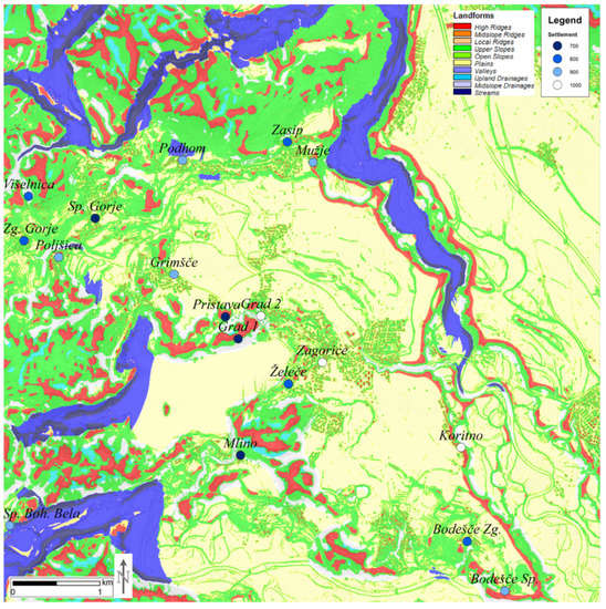 Previous attempts to understand the landscape context of EMS in the Eastern Alpine region often reduced observations to height above sea level and soil type. One early analysis found that Slavs in Slovenia settled mainly in upland areas with dry soils and tended to avoid plains, narrow valleys, and wet soils []. In a preceding analysis of the Bled microregion, the reconstruction of the field system located the most suitable areas for early medieval agriculture and concluded that local topography had a direct influence on the EMS location choice model [,,]. A similar attempt to define the landscape type and soil type in which EMS occurs was made in Lower Austria. Under the term mesoregion, 36 EMS were analysed within their respective 5 km radii. Soil type and geomorphological context, which provided a description of the predominant landform types, were considered. The results showed that the EMS occur in two landscape types: (flood) plains and mountainous regions. Approximately half of EMS were located on alluvial river terraces, at least some of them within coeval floodplains on naturally elevated land. The other half of EMS was located in upland and hilly areas above 300 m a.s.l. In these areas, loess and brown earth soils were clearly preferred [].