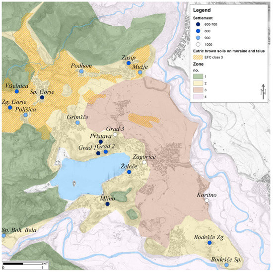 Zone 3 represents a large till plain formed in postglacial fluvial processes that deposited up to several tens of metres of Quaternary sediments. It is limited by the riverbeds of Sava Dolinka and Sava Bohinjka (TPI class Plains; 510–480 m a.s.l). Over the glaciofluvial sand gravel deposits (Table 4: pr), fertile deposits of brown soils developed. However, due to the high porosity of Holocene sediments, the FC is low (FC index 2; mSWI: 0.7), which means that the entire area is exposed to drought. This is exacerbated by the absence of permanent surface water. Nevertheless, there are small patches of hydromorphic soils (Alluvial soils, Hypogley, Amphigley) with high FC (FC index 4; mSWI: 0, −5). Their formation was possible due the glacial activity and postglacial fluvial processes, which have resulted in deposition of clayed sediments north of the Bled lake []. The brown soils in the Zone 3 are the most suitable soils for modern agriculture in the area [], providing that drought effect can be mitigated (for example, by irrigation or drought-resistant crops). Only three EMS, all established only in the eleventh century, are located in Zone 3.