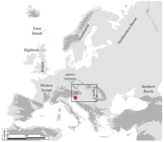 Our particular interest in this paper is EMS in the Bled microregion in the context of agricultural land use. The Bled microregion (80 km2) is located in the northwest of Slovenia, in the subalpine area of Julian Alps. The microregion is bounded by the confluence of the rivers Sava Bohinjka and Sava Dolinka in the east, and by the high mountain plateaus of Pokljuka and Mežakla in the west and north (Figure 3). The area is notable for its intensive fluvio-glacial geomorphology. The archaeological significance of this microregion lies in the fact that it encompasses the entire territory of župa, which was the smallest administrative entity of the early medieval Slavs [,]. Bled has long been the focus of both archaeological and historical research, and from the point of view of early medieval archaeology, it is the best researched microregion in Slovenia. Since the 1880s, and most intensively in the 1970s and 1980s, 17 noteworthy early medieval archaeological sites have been documented by archaeological excavations [,,,,,,,,,] (Table 1; Figure 1).