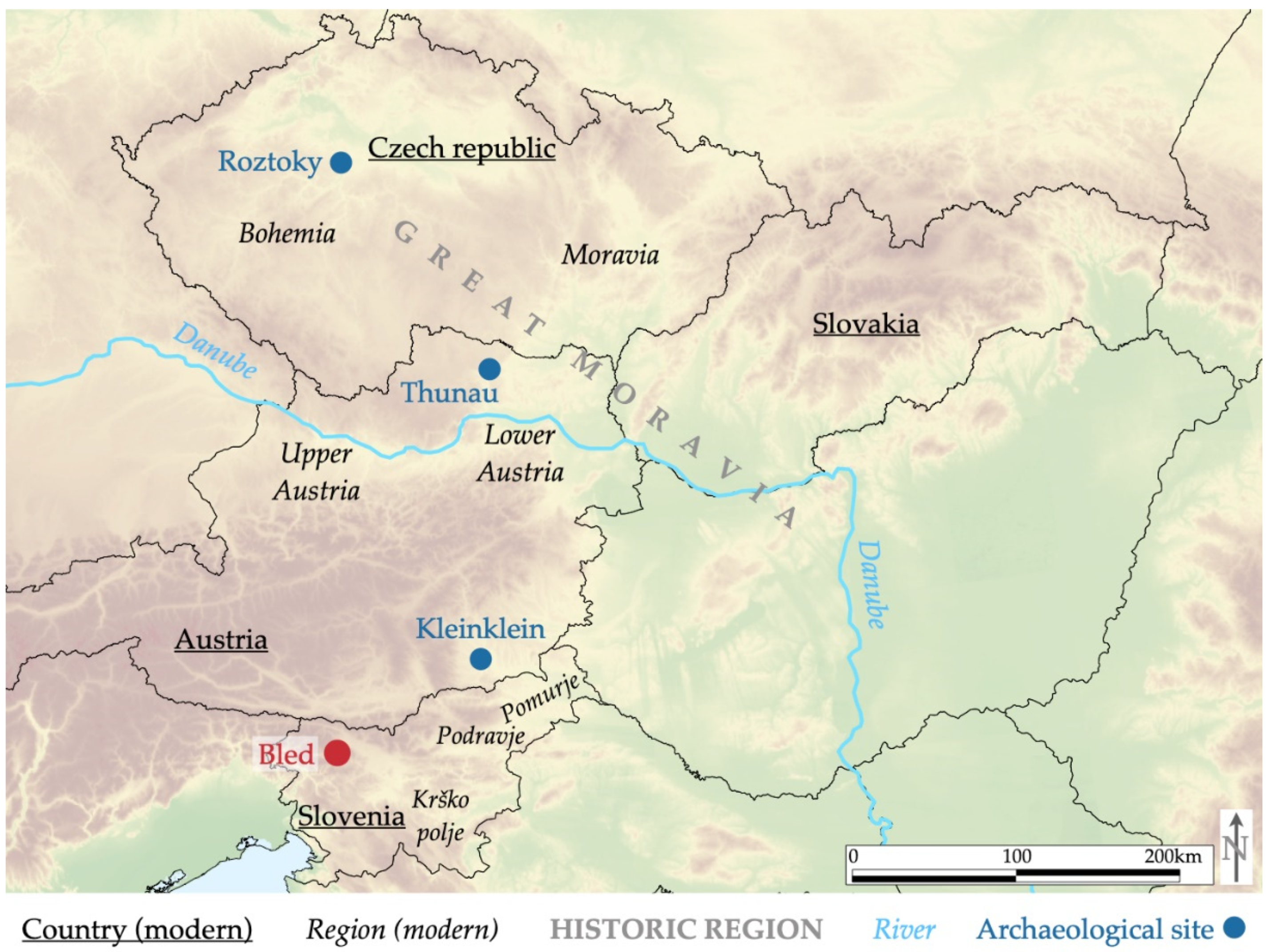 In the archaeologically relevant neighbourhood, river terraces and hills were also recognized as the predominant locations for EMS in Bohemia []. Similar conclusions regarding landscape preference, habitat description, and soil conditions were also drawn for Great Moravia in Czech Republic [] and Slovakia [] and for several microregions in Slovenia (Krško polje [], Prekmurje and Podravje [,], and Bled [,]). A somewhat different situation was detected for the sixth-century Slavs in the Northern Danube region (present-day Slovakia, Moravia, Czech Republic, and Upper Austria), who settled the lowlands in strategic locations along roads and at river fords, while mountainous terrain was avoided [] (Figure 2).