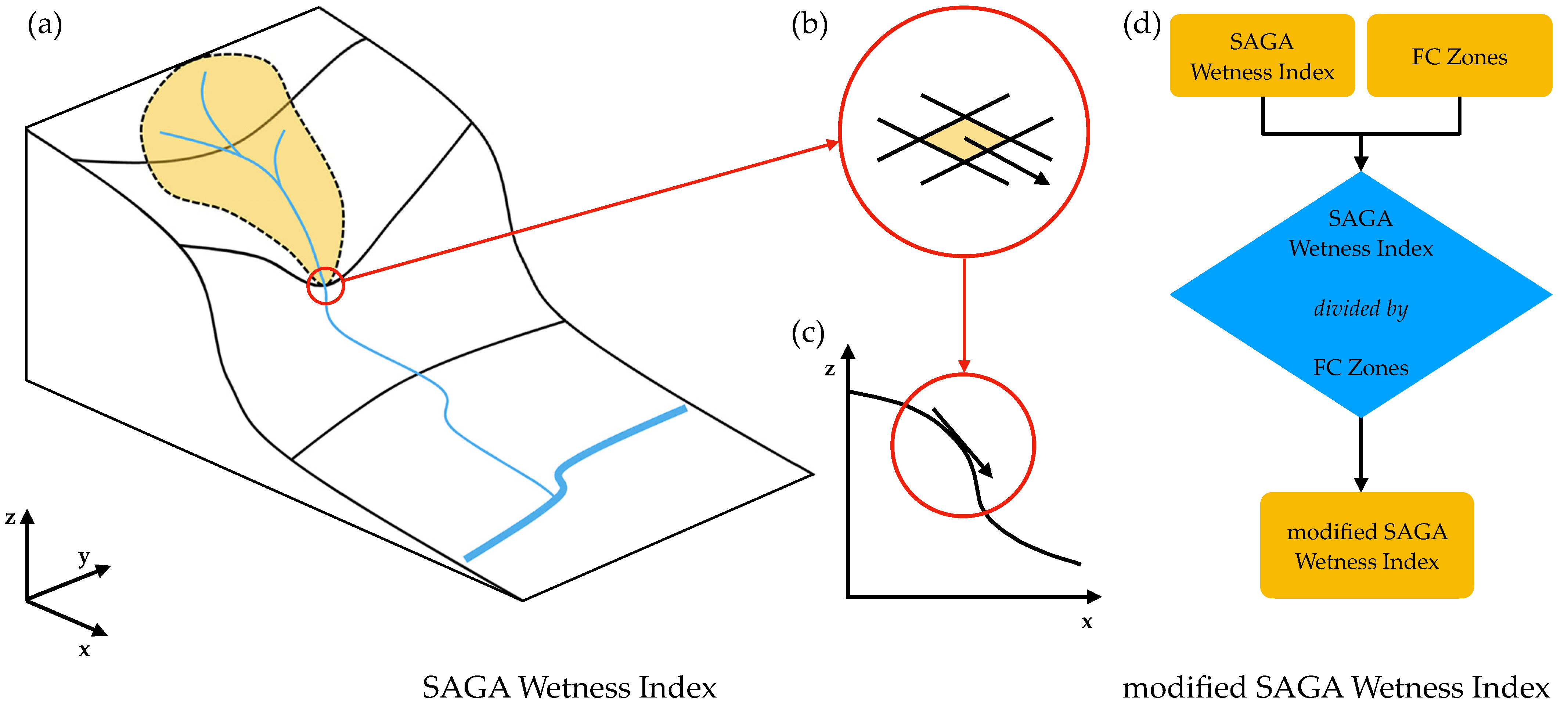 Topographic wetness index: (a) flow accumulation area; (b) flow direction, and the corresponding flow width for a DEM cell; (c) tangent of slope angle; (d) custom algorithm for modified SAGA wetness index ((a–c) adopted from [], Figure 1, published under CC-BY 4.0 licence).