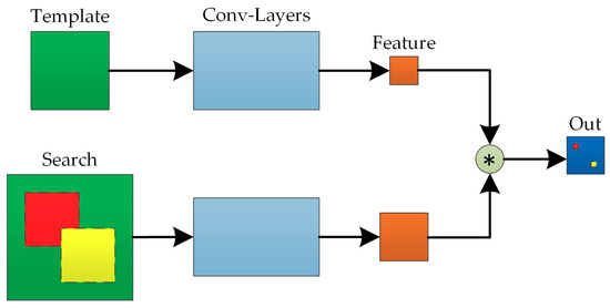 The Siamese network is a supervised learning network framework for metric learning that uses two neural networks with shared weights to compare the similarity of two features through similarity measurement calculations. Different from the traditional object tracking methods, this network structure transforms the object tracking problem into the similarity learning problem, which can not only run in real time on the GPU but can also catch up with or even exceed the related filtering methods combined with depth features in terms of accuracy. Considering that there are few training datasets available in the object tracking field, the Siamese network structure can naturally increase the amount of training data and expand the limited datasets by inputting a pair of images each time, so as to achieve the goal of fully training the network [37]. The Siam-FC network is a classical network model that adopts the Siamese network framework for object tracking and was first proposed by Bertinetto in 2016 [38]. The network structure of the Siam-FC network is shown in Figure 1.