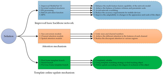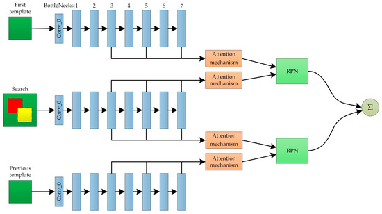 As shown in Figure 3, the proposed network model adopts a three-branch Siamese network structure. In addition to the template branch based on the first frame and search branch, a template branch based on the previous frame is added. The advantage of this structure is that it overcomes the disadvantage of utilizing only the first frame template or the latest template, and it can still track the latest object in real time without introducing complex structures. The feature extraction network is redesigned and the improved MobileNet V2 is used as the basic backbone network. MobileNet V2 is a lightweight CNN released by Google [43]. Its original model is composed of a conventional convolutional layer, seven BottleNecks, and a pooling layer. Compared with AlexNet, MobileNet V2 has a deeper network, smaller volume, and higher accuracy and involves less computation. To realize multi-feature fusion and reduce irrelevant calculations, MobileNet V2 is optimized properly and two convolutional layers of the seventh BottleNeck and pooling layer are removed. Furthermore, to fully utilize the deep and shallow features, multiple attention mechanisms are introduced after BottleNecks 3, 5, and 7 to achieve a significant expression of the object features. The attention-adjusted feature maps are input into the region proposal network branches, and a weighted summation on the classification and regression results of the two template branches is performed to achieve the accurate object tracking. The double-template Siamese network model based on multi-feature fusion improves and optimizes the traditional template structure of the Siamese network, which is conducive to achieving a balance of feature richness and parameter scale.