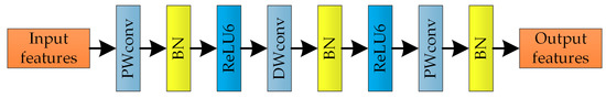 In MobileNet V2, each BottleNeck generally contains one or several inverted residual structures, and the unit of the inverted residual structure is shown in Figure 4. Each inverted residual structure usually consists of 1 × 1 point-to-point convolutional layers, 3 × 3 deep separable convolutional layers, and 1 × 1 point-to-point linear convolutional layers. Compared with the traditional residual structure, the dimensions of the inverted residual structure are first expanded and then compressed to increase the number of channels and obtain more feature information. Different from the traditional convolutional layer, the combined use of point-to-point convolutional layers and deep separable convolutional layers greatly enriches the training features, avoids the destruction of the original features, and helps to reduce the number of parameter calculations and improve the efficiency of convolution operations. In addition, batch normalization processing is added after each convolutional layer, and the ReLU6 activation function is added after the first point-to-point convolutional layer and deep separable convolutional layer. The expression of the ReLU6 activation function is as follows: