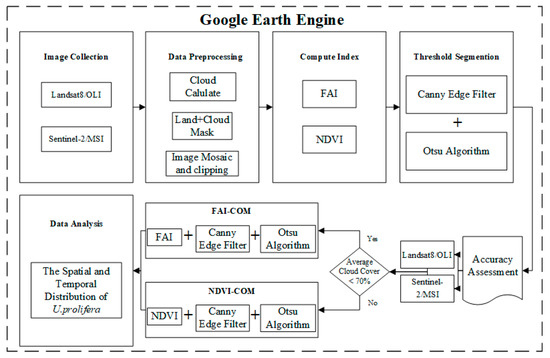 The model was embedded into the GEE platform. After preprocessing the image data, the threshold values in different areas could be automatically selected, which greatly improved the efficiency of monitoring U. prolifera based on remote sensing methods. The technical route of this paper is shown in Figure 4. It should be noted that, after assessing the accuracy of the model, this paper determined the condition for using FAI-COM or NDVI-COM to generate U. prolifera results, and the condition was whether “the average cloud cover was <70% (for all images on the same date in the study area)”. See Section 3.1 and Section 4.1 for details.