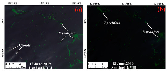Influenced by the environment and physiological characteristics, the spectral reflectance of U. prolifera is different in different periods [12,15,53]. In this study, we selected some images of U. prolifera at different scales and dates to verify the accuracy of the model. Compared with Landsat8/OLI image, Sentinel-2/MSI data have a short revisit period and high resolution (10 m). The method of artificial visual interpretation can be used to verify the accuracy of the model with Sentinel-2/MSI data.