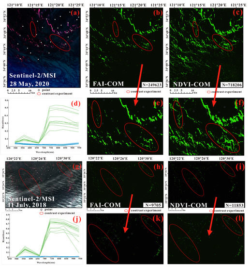 Comparison of U. prolifera extraction from Sentinel-2/MSI images on 28 May 2020 (a–f) and 11 July 2018 (g–l). “N” means the number of U. prolifera pixels. (a,g) Sentinel-2/MSI pseudo-true-color image, R:G:B = band 8:4:3, (b,h) U. prolifera extracted from FAI-COM, (c,i) U. prolifera extracted from NDVI-COM, (d) reflectance spectra with random points of U. prolifera and seawater corresponding to the eight Sentinel-2 bands on 28 May 2020, (e,f) enlarged view of (b,c), respectively, (j) reflectance spectra with random points of U. prolifera and seawater corresponding to the eight Sentinel-2 bands on 11 July 2018, (k,l) enlarged view of (h,i), respectively.
