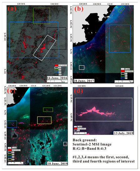 The width of the Landsat8/OLI image is unlike that of the Sentinel-2/MSI image. For better accuracy, different regions of interest were randomly selected from the overlapping regions of two kinds of images. The distribution of regions of interest (ROI) is shown in Figure 7. It should be noted that on 13 July 2019, there were a large number of clouds in the study area, and there were few U. prolifera in the Landsat8/OLI images on that day, so only one region of interest was selected.