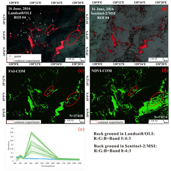 Comparison of U. prolifera extraction in #4 ROI on 16 June 2016. “N” means the number of U. prolifera pixels. (a) Landsat8/OLI pseudo-true-color image, R:G:B = band 5:4:3, (b) Sentinel-2/MSI pseudo-true-color image, R:G:B = band 8:4:3, (c) U. prolifera extracted from FAI-COM, (d) U. prolifera extracted from NDVI-COM, (e) reflectance spectra with random points of U. prolifera and seawater corresponding to the seven Landsat8 bands on 16 June 2016.