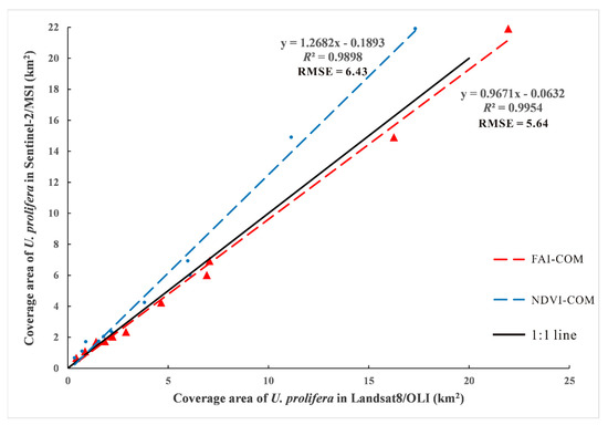 This paper analyzed the correlation between the area of U. prolifera extracted from the two algorithm models (Figure 9). The correlation results showed that, through study area thresholds, the area of U. prolifera extracted by two models were well correlated (greater than 0.9), but the root mean square error of FAI-COM was small (RMSE = 5.64).