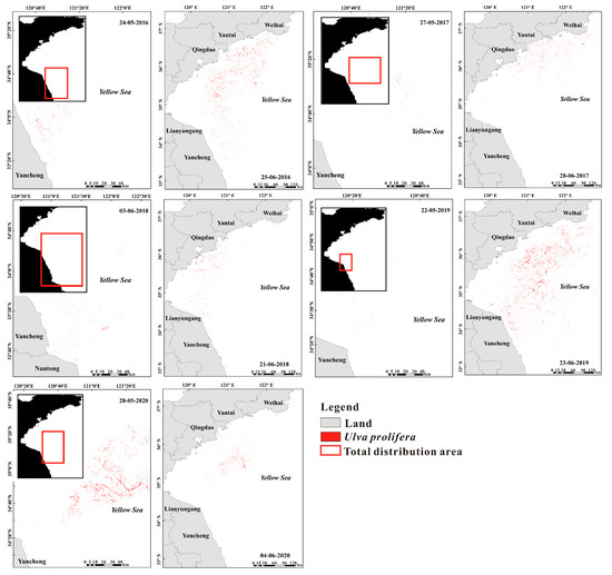 Temporal and spatial distribution of U. prolifera in the study area from 2016 to 2020. Only two representative images with the earliest discovery date and the largest daily area of U. prolifera were selected for each year.