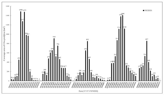 On 25 June 2016, U. prolifera had the largest scale and the widest distribution range (from the eastern sea area of Yancheng City, Jiangsu Province to the southern sea area of Weihai City, Shandong Province). The daily coverage area of U. prolifera was about 1582 km2, which was the largest coverage area of U. prolifera in the five years. In general, 2016 was the largest outbreak of U. prolifera in the five years. Previous studies have shown that 2015 was the most serious year of the U. prolifera disaster in the study area. After that, in 2016, the coverage area of U. prolifera decreased, but the distribution scope and duration persisted [57,58,59].