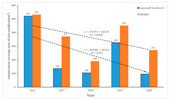 Through the annual average statistics of the coverage area of U. prolifera in the five years (Figure 13), it was found that the area showed a decreasing trend year by year. And the results of MODIS were consistent with those of Landsat8/OLI and Sentinel-2/MSI. In general, the interannual coverage of U. prolifera in 2017, 2018, and 2020 was relatively small, while that of 2016 and 2019 was relatively large. Among the Landsat8/OLI and Sentinel-2/MSI results, the annual average area of algae in 2016 was the largest (521 km2); compared with 2017 and 2018, the annual mean coverage of algae in 2019 increased to about 326 km2.