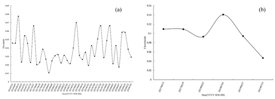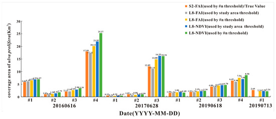 Therefore, this paper selected four Landsat8/OLI images with repeated dates in Section 3.1, used the thresholds obtained in the whole study area to calculate the extraction area of U. prolifera in the ROI (small area), and then compared the stability of the model (Figure 14). It should be noted that the dynamic threshold model could extract the threshold in different ranges and had high accuracy (as shown in Figure 9). Therefore, the true value in Figure 14 was the area of U. prolifera, extracted by the dynamic threshold model based on the ROI in Sentinel-2/MSI images.