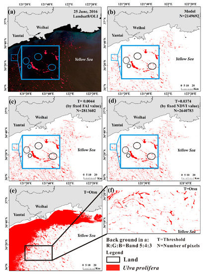 Comparison of adaptive threshold model with other methods. The blue box is the zoom of the same area in (a–d). (a) Landsat8/OLI pseudo-true-color image on 25 June 2016, R:G:B = band 5:4:3, (b) distribution map of U. prolifera based on the model in this paper, (c) distribution map of U. prolifera based on a fixed FAI threshold of 0.0044, (d) distribution map of U. prolifera based on a fixed NDVI threshold of 0.0374, (e) distribution map of U. prolifera based on the Otsu method, (f) distribution map of U. prolifera based on the Otsu method from the black box area in (e).