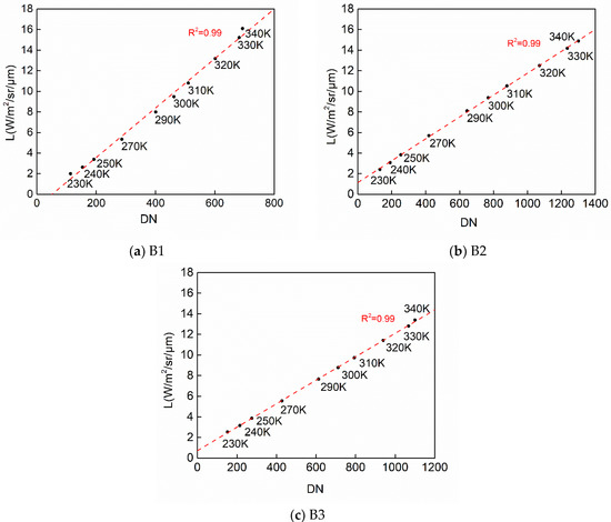 Calculated spectral radiance for nine given temperatures as a function of the DN (background subtracted). (a) The DN (x-axis) versus spectral radiance (y-axis) for B1. (b) The DN (x-axis) versus spectral radiance (y-axis) for B2. (c) The DN (x-axis) versus spectral radiance (y-axis) for B3. Red-dashed lines are linear regression results. R2 is R-Squared. Red dashed lines are the linear fitting results of each band.