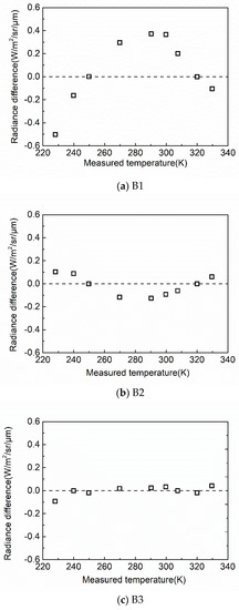 The results are shown in Figure 7. The accuracy has been greatly improved as the radiance difference is within (−0.1, 0.1) in most cases and the radiometric error is less than 1 K at 300 K for three bands.