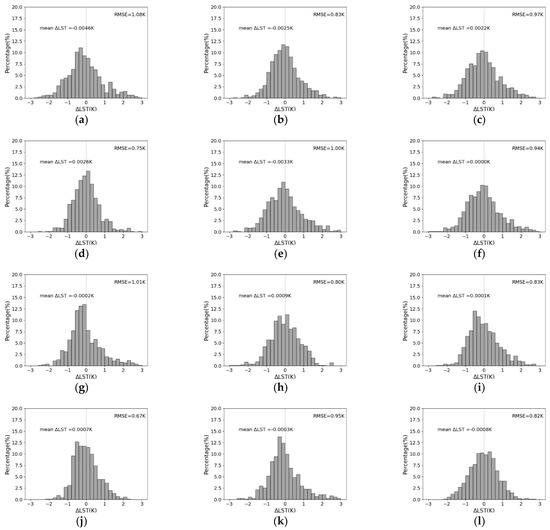 Histogram of the difference between the actual LST and predicted LST (ΔLST) for different land surface types. Two-channel SW algorithm: (a) Soil, (b) Rock and minerals, (c) Vegetation, (d) Water, (e) Man-made, (f) All types. Three-channel SW algorithm: (g) Soil, (h) Rock and minerals, (i) Vegetation, (j) Water, (k) Man-made, (l) All types. Dash lines represent the mean value of ΔLST.