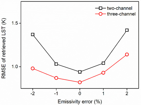 LSE is a key factor that is related to LST retrieval. According to Equation (7), terms and are influenced by uncertainties in LSE. In Equation (8), term is influenced by uncertainties in LSE. In addition, the radiative transfer process is also different based on different LSE. Herein, about (−2%, 2%) error with intervals of 1% was added to investigate the retrieval accuracy when errors were contained in LSEs. Using the two SW retrieval methods, the obtained LST RMSE are shown in Table 6. Results show that the RMSE increased when emissivity errors were introduced. The error has a larger influence on LST results when emissivity is overestimated. It can also be seen from Table 6 and Figure 9, that the RMSE of the three-channel algorithm have less RMSE than the two-channel algorithm, which means that more bands in LST retrieval could decrease the sensitivity to emissivity errors.