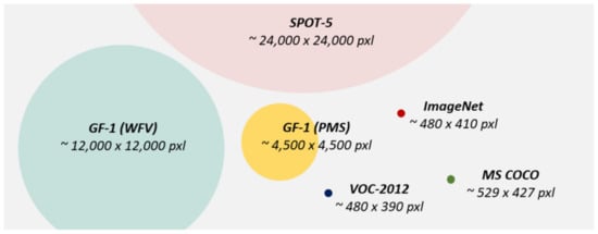 Remote sensing images are the ground information acquired by satellites, aircrafts, and unmanned aerial vehicles in the air. The image quality is susceptible to weather, light, moisture, and other natural factors in the imaging process. Owing to the high shooting position, the background information is more complex, and the imaging area is far more widespread than a natural image. For one image frame, a single-view remote sensing image covers area at least a few tens of square kilometers [47]. Therefore, the data volume of a remote sensing image is larger than that of a natural image [48]. Figure 1 illustrates a data volume comparison between a remote sensing image and a natural image. The above reasons increase the difficulty of satellite images object detection. In the past, the detection targets in remote sensing images were aircrafts and ships [49], which cover a large area. Song et al. detected airplanes and ships from a satellite image by extracting ROIs (airports and ports) containing potential objects which have a clear straight-line contour. This method avoids the problems of low efficiency and high false detection rate in detecting the whole image [50]. Nevertheless, this detection algorithm is only suitable for detecting hierarchical objects with evident geospatial features and cannot be applied to detect other targets, especially small ones. In remote sensing images, an oil well is much smaller than a plane or a ship, which increases the difficulty of detection. This paper proposes a solution to solve the problems of small-object detection in large-scale and high-resolution remote sensing images, which enables oil wells to be detected accurately. The main contributions of this article are as follows: