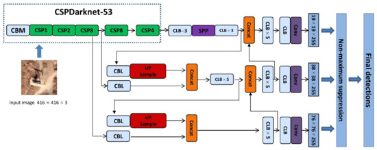 YOLO v4 extracts the target feature through CSPDarknet-53 and generates three feature maps with sizes of 76 × 76, 38 × 38, and 19 × 19, which are used to detect small, medium, and large targets, respectively. The feature map with the size of 19 × 19 is regarded as an example: the input image is split into 19 × 19 grids, and each cell is responsible for the detection of objects in its own area. During detection, the confidence value of each class and the coordinate information of anchor boxes in every grid are computed. The coordinates and the size of the prediction boxes are corrected by adding abscissa, ordinate, width, and height offsets to the corresponding anchor boxes. In YOLO v4, each grid generates three prediction boxes with confidence, coordinates, and size. The non-maximum suppression algorithm is used to filter out the prediction boxes with low confidence to obtain the final prediction result. A simplified layer structure of YOLO v4 is shown in Figure 3.