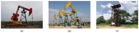 The study area is located in Daqing City of Heilongjiang Province, Northeast China. Daqing Oilfield, the largest continental sandstone oilfield in China, is an important oil production base [51]. The detection type of the oil well in this study is beam-pumping well, which is a ubiquitous equipment in the Daqing Oilfield in accordance with the field survey. The advantages of a beam-pumping well are as follows: (1) strong applicability, reliable operation, and low environmental requirements, which can be used from the north to the south of China; (2) simple structure, convenient maintenance, and long service life. For the above characteristics, it is the most used oil exploration facility in the Daqing Oilfield. Figure 4 shows the types of oil wells recorded in the field survey.
