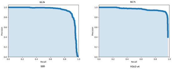 PRC is the area of the precision–recall curve. The higher the PRC value is, the stronger the detection capability of the model is [52]. As shown in Figure 7, the PRC of YOLO v4 (94.7%) was higher than that of SSD (93.2%) in oil well detection.