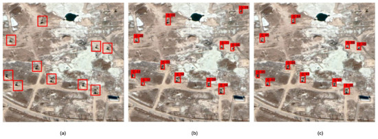 In traditional deep learning object detection algorithms on satellite images, trained models are used to detect objects in small-scale satellite images such as Figure 8a or to detect objects from the captured satellite images (mostly in the JPG format). However, these images are not real remote sensing images because remote sensing has the important characteristic of wide-range coverage area. A single-view satellite image covers at least a few tens of square kilometers. Therefore, object detection in large-scale remote sensing images is more meaningful than that in small-scale ones. Furthermore, the object detection methods for small-scale remote sensing images cannot be applied to large-scale ones because the data volume of the former is much smaller than that of the latter. For the above reason, it is still difficult to detect targets directly in large-scale remote sensing images, especially small targets. To address this issue, YOLO v4 was improved in this study so that it could be used for oil well detection in a large-scale and high-resolution sensing image, which provides a feasible solution for small-object detection in large-scale remote sensing images.