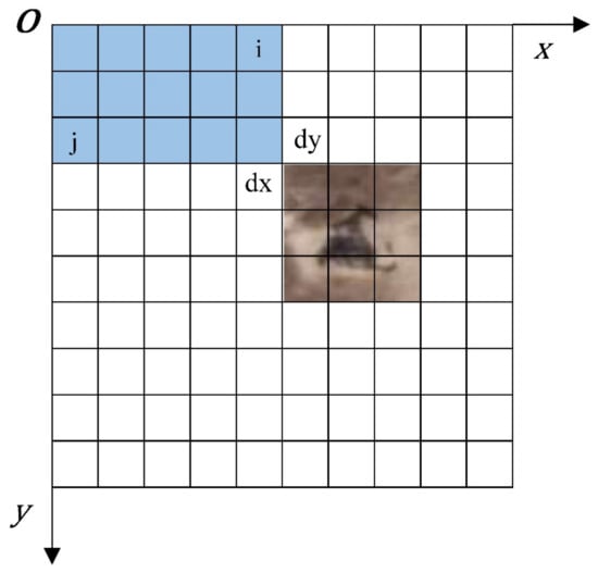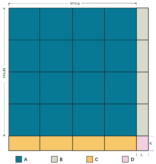 In the detection process, for a large-scale image of any size, when the sliding window is in different positions, the slice size should also be adjusted. In this study, four types of slice sizes are considered. In Figure 12, the size of area A is m × n × 416 × 416 pixels, which can be completely sliced using an initialized sliding window; in area B, L < 416 pixels, which can only be completely sliced in the vertical direction; in area C, K < 416, which can only be completely sliced in the horizontal direction; area D is a single slice with the size of K × L pixels. When the sliding window is located in four different areas, the slice size is dynamically adjusted to ensure accurate motion detection.