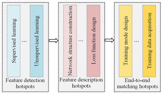 At present, the research on deep-learning methods for wide-baseline image matching mainly focuses on three topics: Feature detection, feature description, and end-to-end matching (see Figure 1). Therefore, this section provides a review and summary of the related work in these research topics below.