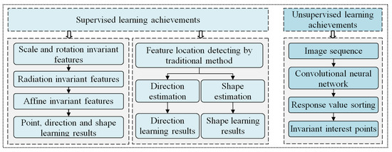Figure 2 summarizes the progress in deep-learning feature-detection methods. Based on the implemented learning mode, the mainstream deep-learning feature-detection algorithms can be divided into two types: Supervised learning [48] and unsupervised learning [49]. Supervised learning feature detection takes the feature points extracted by traditional methods as “anchor points”, and then trains a regression neural network to predict the location of more feature points; whereas the unsupervised learning strategy uses a neural network directly to train the candidate points and their response-values, and then takes the candidate points at the top or bottom of the ranking as the final feature points.