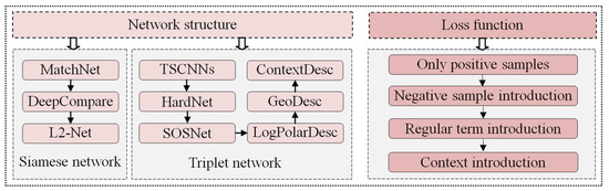 Deep-learning feature description [59] has been widely applied in professional tasks [60] such as image retrieval, 3D reconstruction, face recognition, interest point detection, and target positioning and tracking. Specific research on this topic mainly focuses on network structure construction and loss function design, as shown in Figure 3. Among them, the network structure of deep learning directly determines the discrimination and reliability of the feature descriptors, while the loss function affects the training performance of the model by controlling the iterative update frequency of the model parameters and optimizing the quantity and quality of the sample input.