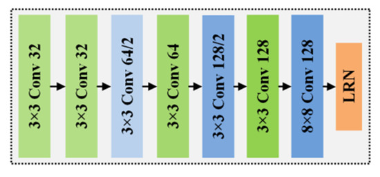 These descriptor measurement networks belong to the fully connected category of networks, which consume a large amount of computing resources during training and testing, and hence have low matching efficiency. To address this, Tian et al. proposed a feature description model called L2-Net [67] with a full convolutional network representation. This method inherits the idea of SIFT descriptors, namely, it adjusts the dimension of network output to 128 and uses the L2 norm measure of Euclidean distance instead of a metric network to evaluate the similarity of the feature descriptors. The basic structure of the L2-Net network is shown in Figure 5. This network consists of seven convolutional layers and a local response normalization layer (LRN). In the figure, the term “3 × 3 Conv” in the convolutional layer refers to convolution, batch normalization, and linear activation operations in the series, and “8 × 8 Conv” represents the convolution and batch normalization processing operations. Moreover, “32” represents a 32-dimensional convolution with a step size of 1 and “64/2” refers to a 64-dimensional convolution operation with a step size of 2. The final output layer LRN is used to generate unit descriptor vectors while accelerating network convergence and enhancing model generalization.