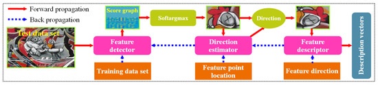 The back propagation-based training process of LIFT can be briefly described as follows. First, the feature location and principal direction can be extracted using the structure from motion (SFM) algorithm [80], and then the feature descriptor is trained. Second, guided by the feature descriptor, the direction estimator is trained based on the feature location and its neighborhood ST. Finally, the feature descriptor and direction estimator are united to train the feature detector based on the training dataset. After the LIFT has been trained, the corresponding test process proceeds as follows. First, the feature score map of a multi-scale image is obtained based on the feature detector. Second, scale-space non-maximum suppression is performed using the softargmax function and then the scale invariant feature region is extracted. Finally, the feature region is further normalized and then the description vectors are extracted by the feature descriptor.