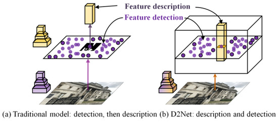 The learning-based method of MagicPoint can replace the handcrafted labeling of feature points, but a small amount of handcrafted labeling data is still required when obtaining the pre-trained model. Ono et al. [85] proposed LF-Net, which is an end-to-end model that uses unsupervised training. This method directly uses the stereo images obtained by a metric camera, an image depth map, the camera position, and orientation data, and other prior information to complete the end-to-end model training, which greatly reduces the need for manual intervention and promotes the automated process of deep-learning matching. In addition, Dusmanu et al. proposed a combination of feature detection and descriptor extraction that can make more effective use of high-level semantic information. They then proposed a simplified end-to-end model D2Net [86]. The difference between this model and the traditional model is depicted in Figure 8. Figure 8a shows the traditional “detect-then-describe” model, that is, SuperPoint [81], which is a representative model of this type, and Figure 8b shows the D2Net “describe-and-detect” model. In contrast to a Siamese or multi-branch network structure [87], D2Net adopts a single-branch network architecture, and the feature location and descriptor information of the image are stored in high-dimensional feature channels, which is thus more conducive to obtaining stable and efficient matches. However, D2Net must extract dense descriptors in the process of using high-level semantic information, which reduces the accuracy and efficiency of feature detection.