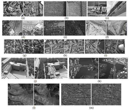 (a–m) Wide-baseline test data. These data are carefully selected from different platforms of ground close-range, UAV, and satellite, respectively. They cover various terrains and have significant viewpoint changes.