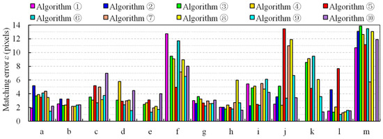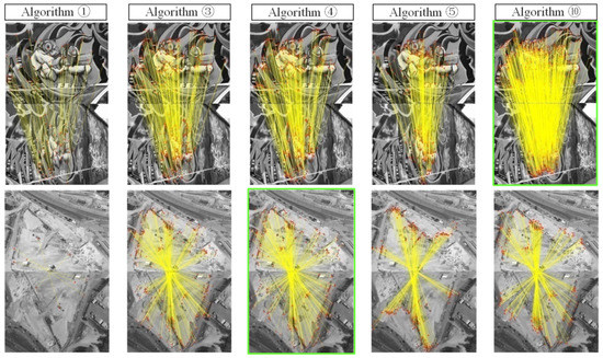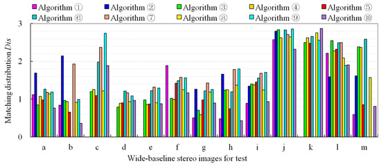 where N is the number of matches, and are an arbitrary pair of matching point coordinates, and H and F are the known true perspective transformation matrix and true fundamental matrix, respectively. The matching errors of test data (a)–(f),which consist of planar or approximately planar scenes, are evaluated by εH (pixel), and the matching errors of test data (g)–(m), which consist of non-planar scenes, are evaluated by εF (pixel). Figure 11 shows the image-matching results of each algorithm. Because of the limited space, this figure only exhibits the matching results of algorithms ①, ③, ④, ⑤, and ⑩ based on test data (a), (f), (g), (i), (j), and (m), where the matching points are indicated by red dots and joined by yellow lines, and the most matches in each row of the figure are marked by a green frame. For each algorithm, Figure 12 shows the matching distribution quality Dis, which is estimated by the following equation [96]: