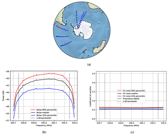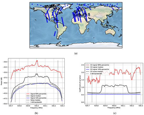 Figure 3a). The measurements over non-populated areas can be used as an in-orbit relative noise floor and justify the use of heatmaps over these areas since the behaviour is close to Gaussian. In the power spectrum, there is a variation that can be caused by the tumbling of the satellite that introduces a variation in antenna gain and polarisation, as well as a variation in internal temperature. On several of the measurement tracks, the satellite moved from daylight (highest internal temperature) to eclipse (lowest internal temperature). This could also be the explanation why the temporal behaviour is not completely Gaussian; perhaps there is a slow variation of internal temperature causing this difference.