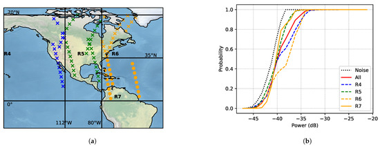 21]; and areas in the ocean (South Pacific and South Atlantic). All measurements are referred to as interference over populated areas, except for the last category. The latter are named noise measurements over non-populated areas because the spectra measured had lower power and because there are lower population concentrations.