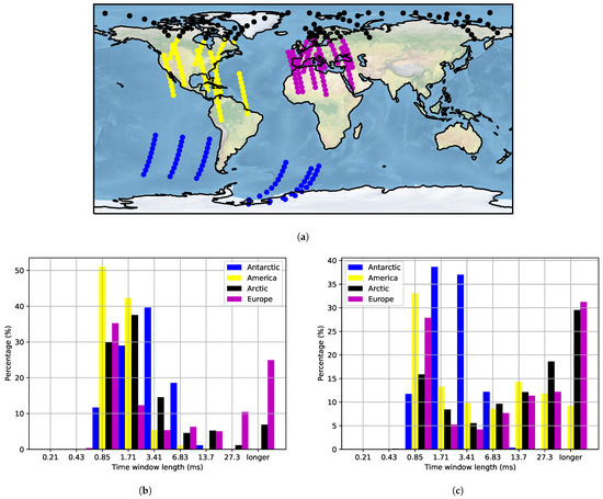 The window of stationarity can be used as the required length of an interleaver to obtain average coding performance for each interleaved interval. Even though a lot of measurements are required to increase the reliability of the estimation of the length of this window, we can identify regional trends. For frequencies in the range 434.75–434.83 MHz and 435.19–435.25 MHz, the length could be less than 14 ms for most cases and regions. For the Arctic and Europe, longer lengths are needed for more reliability. In the band 434.83–435.19 MHz, there is a significant portion of measurements over America, Europe, and the Arctic, where window lengths longer than 27 ms are needed.