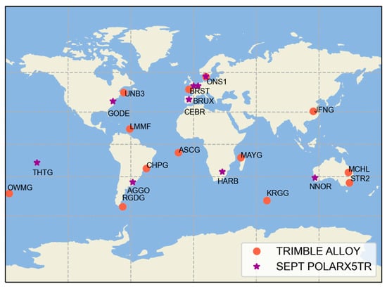 Ground tracking stations, red dots denote 13 SEPT receivers tracking GPS/Galileo Q signals, stars represent 9 TRIMBLE receivers tracking GPS/Galileo X signals.