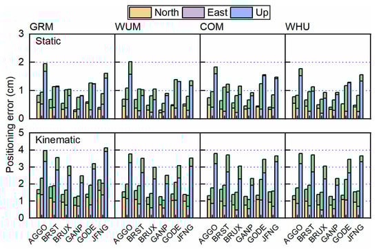 The positioning error of GPS-only float/fixed PPP solutions with static (top) and kinematic (bottom) mode in north, east, up components of nine days average for different stations with GRM, WUM, COM, and WHU products. The orange, purple, and blue bar denote fixed PPP solution in north, east, and up components, which plus green bar represents the corresponding float PPP solution.