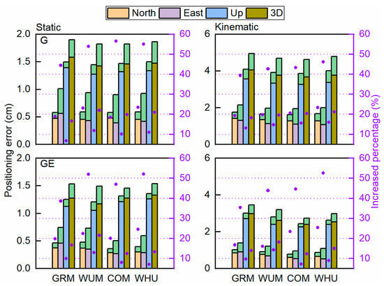 Averaged positioning error of GPS-only and GE float/fixed PPP static (left) and kinematic (right) in north, east, up, and 3D components with GRM, WUM, COM, and WHU products. The orange, purple, blue, and brown pillar denotes fixed PPP solution in north, east, up, and 3D components, which plus green pillar represents the corresponding float PPP solution. The blue dots show the increased percentage of the fixed solution compared to the float.