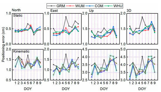 Average positioning errors series among nine days of static (top) and kinematic (bottom) GPS-only PPP AR in north, east, up, and 3D components with GRM, WUM, COM, and WHU products.