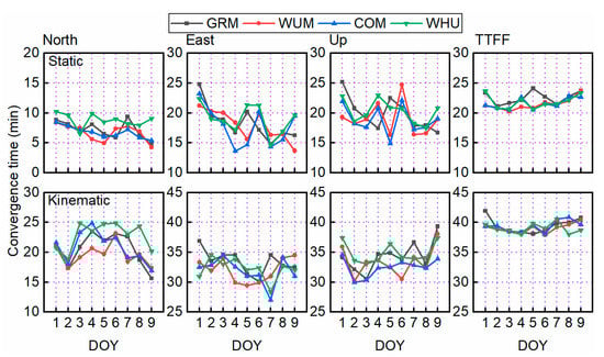 Figure 5 depicts the average positioning errors derived from different AC products with static mode maintained stability among the nine days in the north, east and up components as well as in the 3D direction, respectively, except for the GRM products from CNES. This was especially the case for the east component. Previous research has indicated that WUM FCB products corresponding to CNES maintained high conformity with GRM IRC products []. Thus, the reasonable explanation for this phenomenon is the that PPP strategy cannot maintain good consistency with GRM products resulting in some bad station solutions, which magnifies the average positioning errors. For the kinematic situation, the average positioning errors were more volatile among the days’ solution due to the weaker model. From the Table 2, the average positioning performance among nine days with GRM, WUM, COM, and WHU products, ranging from 0.45 to 0.47 cm, from 0.39 to 0.56 cm, and from 1.27 to 1.39 cm for static GPS-only PPP AR and from 1.28 to 1.42 cm, from 1.07 to 1.3 cm, and from 3.3 to 3.6 cm for kinematic PPP AR in the north, east, and up components, respectively. Among the average positioning accuracy with the four AC products, the differences were less than 3 mm for both static and kinematic PPP AR, which shows that a comparable positioning accuracy can be achieved by using different AC products. Like the positioning performance, the convergence time shown in Figure 6 ranged from 6.70 to 8.8 min, from 17.7 to 19 min, and from 18.8 to 20.3 min for static PPP AR and from 19.6 to 22.8 min, from 31.9 to 33.4 min, and from 32.5 to 34.9 min for kinematic PPP AR in the north, east, and up components, respectively. Furthermore, TTFF was defined as the time taken for the ambiguity-fixed solution to be successfully achieved for at least five epochs, which is an important indicator to evaluate PPP AR performance. Figure 5 shows that the average TTFF of kinematic PPP AR was 39.4, 39.0, 39.4, and 38.9 min with the GRM, WUM, COM, and WHU products and it was about 2.0 times that of static PPP AR, which was 20.3, 22.6, 21.5, and 21.9 min, respectively.
