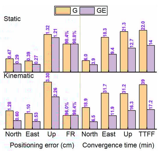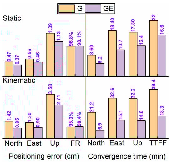 For a comparison of the float and fixed PPP solutions, once the integer property of ambiguities was recovered, the positioning accuracy could be significantly improved compared to float PPP, especially for the east component. The results with different AC products were comparable with each other. Concretely, the static positioning errors can be reduced by 21.0% (to 0.46 cm), 52.5% (to 0.45 cm), 10.0% (to 1.33 cm) and 21.7% (to 0.33 cm), 47.4% (to 0.34 cm), 9.5% (to 1.16 cm) for GPS-only and GE combination in north, east, up component, respectively, while the reductions are 20.8% (to 1.13 cm), 42.9% (to 1.15 cm), 19.9% (to 3.4 cm) and 20.4% (to 0.72 cm), 44.1% (to 0.66 cm), 10.1% (to 2.44 cm) for kinematic PPP AR.