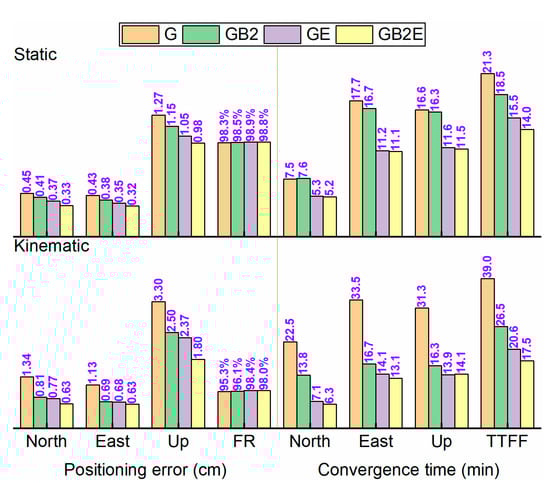 For different combinations of GNSS, the positioning accuracy of ambiguity-fixed static PPP was almost at the same level, since the unmodeled errors have less influence on the estimated precision parameters after a long time of convergence and correctly fixed ambiguities. While the positioning accuracy had more obvious improvements for kinematic PPP AR, the PPP model was strong since there were more observations. The FR was improved but not obvious among different combinations of GNSS solutions. The most significant improvements were in the convergence time and TTFF after aiding multi-GNSS. Taking kinematic mode as an example, the statistics show that typical value of convergence times were (6.9, 15.1, 14.6) min in the north, east, up components, respectively, and 18.3 min for TTFF with GRM products for the GNSS combination PPP AR. Under the same circumstances, the values were (6.3, 13.1, 14.1) min and 17.5 min for COM products, (6.5, 11.9, 16.3) min and 17.2 min for WUM products, (9.2, 17.5, 18.3) min and 20.8 min for WHU products, respectively. Figure 8 and Figure 10 show the positioning performance in terms of convergence time, positioning accuracy and TTFF derived from the static and kinematic modes, and GB2 PPP AR showed a much worse performance compared to GE PPP AR. This is because the precise orbit and clock of BDS-2 are less precise than those of GPS and Galileo. Figure 7, shows that, after adding the BDS-3 satellite to enhance GB2 PPP AR, the positioning performance was comparable with combined GPS and Galileo PPP AR. As for the combined GPS, Galileo, BD2, and BD3, the triple-GNSS PPP AR could further accelerate the convergence and shorten the TTFF.