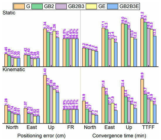 Average performance of multi-GNSS PPP AR in static (top) and kinematic (bottom) mode with GRM products. FR is defined as the ratio of the number of fixed epochs to the number of total epochs after TTFF and TTFF means time to first fix. The specific value is recorded at the top of the bar.
