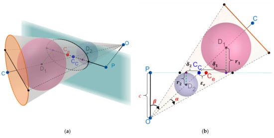 where and are the radii of the two tangential Dandelin spheres, is the half-angle of the cone, is the angle between the cone’s axis and the intersecting plane’s normal, is the semi-minor length of the best fit ellipse, and is the camera’s principal distance (focal length). Using the notations of Figure 1b, the eccentricity error, , can be derived as follows:
