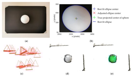 The perspective projection of a sphere onto an image is an ellipse. This is because the camera’s perspective center and a sphere in its field-of-view create a cone, whereby the intersection of the cone and the image’s plane generate an ellipse. The center of the ellipse in the image, even in the absence of measurement errors, however, does not correspond to the projected center of the sphere onto the image (see Figure 1 and Figure 2). This phenomenon is commonly referred to as the eccentricity error in projective geometry []. The eccentricity error is an important factor in applications requiring high precision metrology such as tracking balls in sporting events (e.g., FIFA goal-line technology []), as well as calibration [] and registration [] of optical instruments. In fact, the eccentricity error has been shown to produce considerable errors in 3D reconstruction of the sphere’s center from simulated stereopair images []. The real-world impact of the eccentricity error in multi-view 3-dimensional (3D) reconstruction has, however, not yet been investigated in the literature. Modeling the eccentricity error in images is, hence, an important step towards accurate 3D reconstruction of spherical objects from images. To this end, the objectives of this article are to: (i) provide a closed form solution to the eccentricity error of the center of spheres, projected onto images; (ii) develop a new method for robust sphere detection in 3D reconstructed point clouds; and (ii) evaluate the effect of modeling the eccentricity error in estimating the 3D coordinates of the center of a sphere as the number of camera views increase.